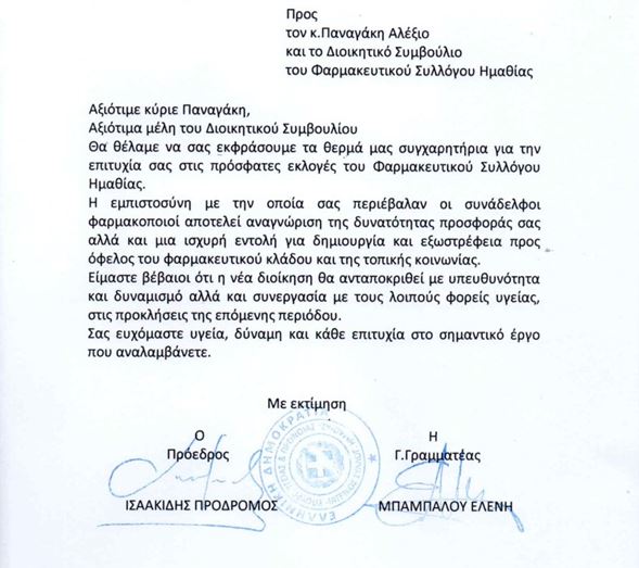 Συγχαρητήρια επιστολή του Ιατρικού Συλλόγου Ημαθίας στη νέα διοίκηση του φαρμακευτικού συλλόγου