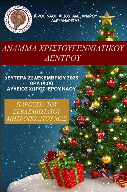 Η Αλεξάνδρεια φορά τα γιορτινά της και υποδέχεται με χαρά την πιο φωτεινή στιγμή των Χριστουγέννων: το άναμμα του Χριστουγεννιάτικου δέντρου στον προαύλιο χώρο του Ιερού Ναού Αγίου Αλεξάνδρου, την Δευτέρα 22 Δεκεμβρίου 2025.