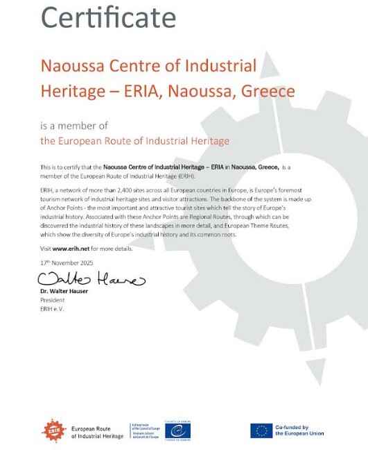 Το Κέντρο Βιομηχανικής Κληρονομιάς Νάουσας "ΕΡΙΑ" εντάχθηκε και αποτελεί πλήρες μέλος του Δικτύου Ευρωπαϊκής Διαδρομής Βιομηχανικής Κληρονομιάς (ERIH: European Route of Industrial Heritage) έπειτα από την αποδοχή της σχετικής αίτησης από τον Δήμο Η.Π. Νάουσας.