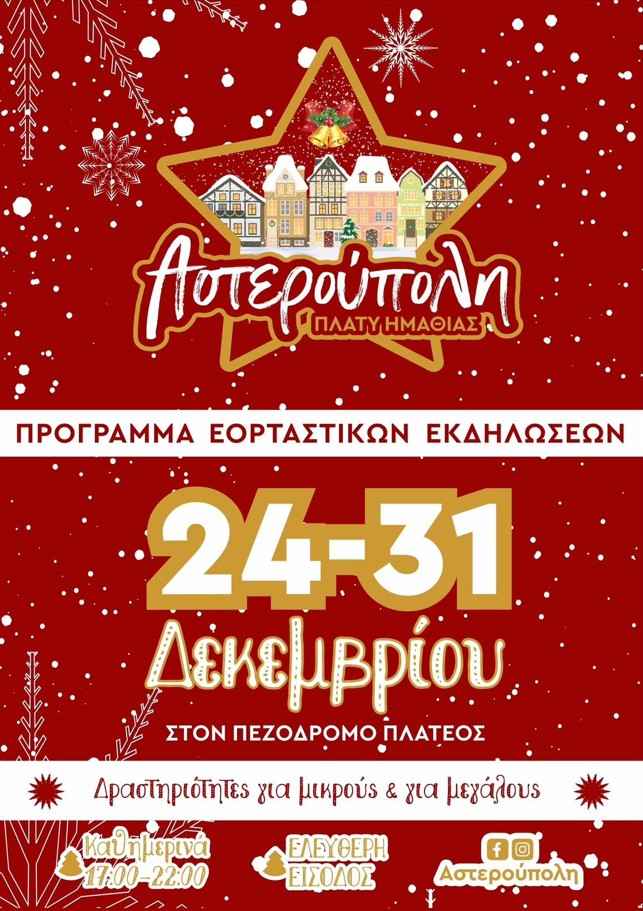 Η Αστερούπολη είναι το χριστουγεννιάτικο χωριό που στήνεται κάθε χρόνο στον πεζόδρομο του Πλατέος στην Ημαθία. Στόχος της είναι να δημιουργήσει ένα παραμυθένιο σκηνικό γεμάτο φώτα, μουσικές, γεύσεις και δράσεις που φέρνουν κοντά την τοπική κοινωνία.