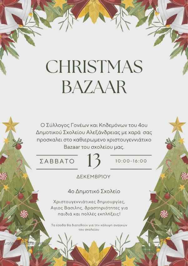 Ο Σύλλογος Γονέων και Κηδεμόνων του 4ου Δημοτικού Σχολείου Αλεξάνδρειας σας προσκαλεί στο Χριστουγεννιάτικο Bazzar του στον χώρο του σχολείου το Σάββατο 13/12, 10:00-16:00.