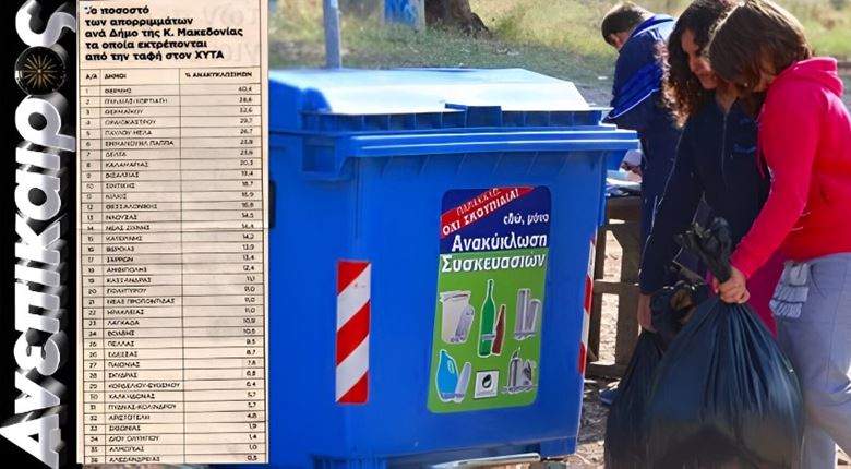 Στην τελευταία θέση ανάμεσα σε 36 δήμους της Περιφέρειας Κεντρικής Μακεδονίας κατατάσσεται ο Δήμος Αλεξάνδρειας όσον αφορά το ποσοστό των απορριμμάτων που εκτρέπονται από την ταφή στον ΧΥΤΑ και οδηγούνται προς ανακύκλωση σύμφωνα με δημοσίευμα της εφημερίδας Μακεδονία.