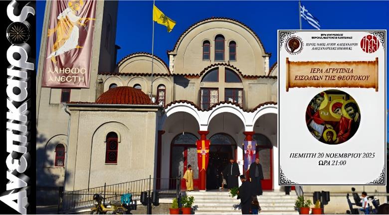 Iερά Αγρυπνία θα τελεσθεί στην Ιερά Μονή Αγίας Κυριακής Λουτρού την Πέμπτη 20 Νοεμβρίου και ώρα 19:00, επί τη εορτή των Εισοδίων της Υπεραγίας Θεοτόκου.