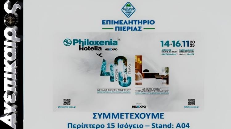 Το Επιμελητήριο Πιερίας συμμετέχει στην 40η Διεθνή Έκθεση Τουρισμού Philoxenia – Hotelia 2025, με δικό του εκθεσιακό περίπτερο, η οποία θα πραγματοποιηθεί στις 14-16 Νοεμβρίου, στο Διεθνές Εκθεσιακό & Συνεδριακό Κέντρο Θεσσαλονίκης. Στόχος είναι η προβολή του τουριστικού προϊόντος της Πιερίας και η στήριξη των τοπικών επιχειρήσεων του κλάδου.