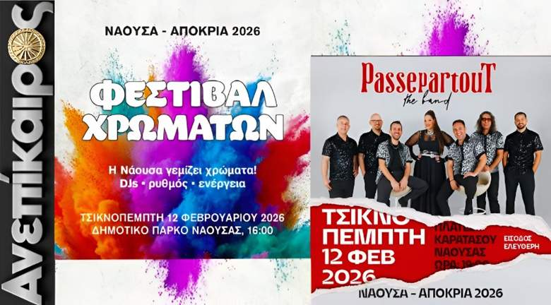 Με συμμετοχή δημοτών και επισκεπτών άνοιξε την Πέμπτη 12 Φεβρουαρίου 2026 (Τσικνοπέμπτη) η αυλαία των εκδηλώσεων «Νάουσα–Αποκριά 2026», που διοργανώνει ο Δήμος Ηρωικής Πόλεως Νάουσας, σηματοδοτώντας την έναρξη μιας ακόμη δυναμικής αποκριάτικης περιόδου για την πόλη και τον Δήμο Νάουσας.