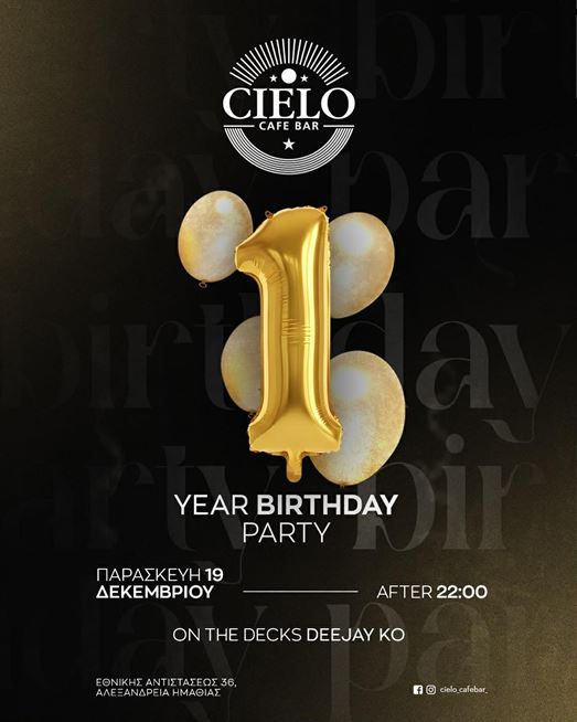 Ένας χρόνος γεμάτος μουσική, χαμόγελα και αμέτρητες στιγμές στον πεζόδρομο της Αλεξάνδρειας. Το cafe bar CIELO, το στέκι που έγινε αγαπημένη συνήθεια για τους φίλους της πόλης, γιορτάζει τα πρώτα του γενέθλια και σας καλεί όλους σε ένα ξέφρενο πάρτι που θα μείνει αξέχαστο.