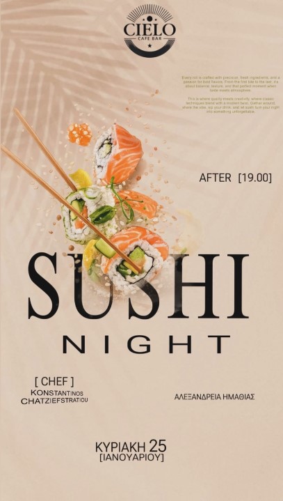Λίγο μετά τις 7 το βράδυ, το Cielo Cafe Bar θα μεταμορφωθεί σε έναν παράδεισο για τους λάτρεις του sushi. Ο chef Κωνσταντίνος Χατζηευστρατίου, γνωστός για την τέχνη του και τη δημιουργικότητά του, θα επιμεληθεί ένα μενού που θα ενθουσιάσει ακόμα και τους πιο απαιτητικούς ουρανίσκους.