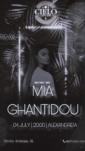 Ετοιμαστείτε για μια βραδιά γεμάτη ρυθμό, χορό και τραγούδι, καθώς το cafe bar CIELO, στον πεζόδρομο της Αλεξάνδρειας, υποδέχεται την Παρασκευή 4 Ιουλίου την ταλαντούχα Mia Ghantidou!