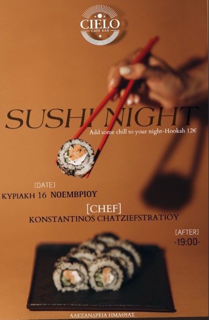 Ετοιμαστείτε για μια μοναδική βραδιά γεύσης και διασκέδασης! Το Cielo Cafe Bar, το αγαπημένο στέκι στον πεζόδρομο της Αλεξάνδρειας, διοργανώνει ένα ξεχωριστό Sushi Night την Κυριακή 16 Νοεμβρίου, με τον καταξιωμένο chef Κωνσταντίνο Χατζηευστρατίου!