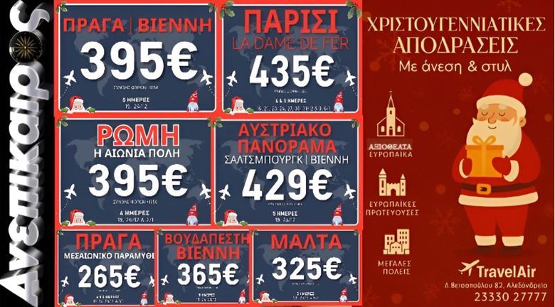Καθώς οι γιορτές πλησιάζουν και η μαγεία των Χριστουγέννων αρχίζει να απλώνεται στην ατμόσφαιρα, το ταξιδιωτικό γραφείο Travel Air, στην καρδιά της Αλεξάνδρειας (Δ. Βετσοπούλου 82), ετοιμάζει τις πιο ονειρεμένες εκδρομές για τον Δεκέμβριο και τις γιορτές.